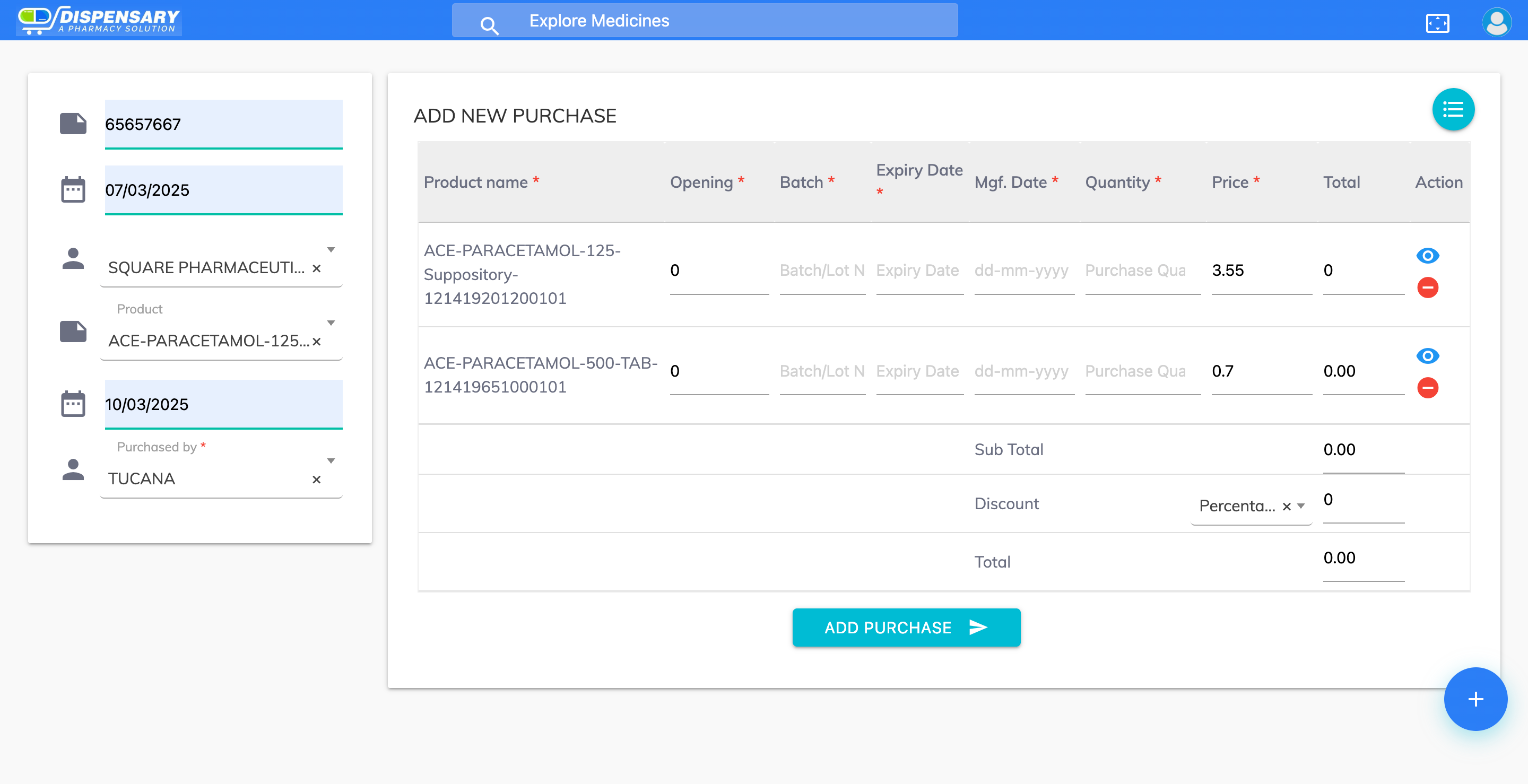 Dispensary product purchase and return system allows easy point-of-sale creation across devices, product purchasing from suppliers, and product returns or exchanges. It tracks purchases by batch number and expiry date, updates stock with first-in, last-out processing, and provides purchase lists with filters. The system also supports barcode printing, purchase tracing, payments, and return handling based on invoices. Additionally, it includes alerts for minimum order levels.