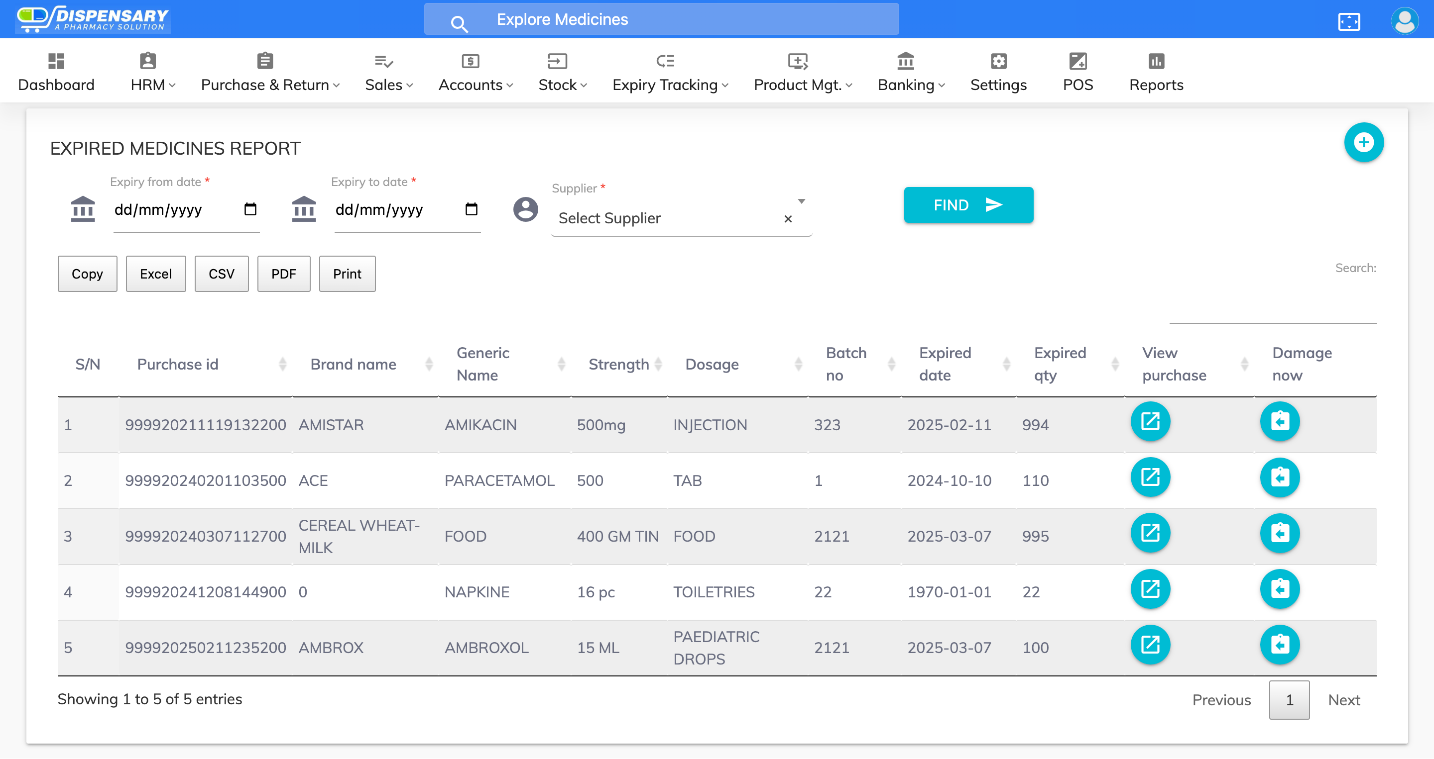 Dispensary expiry tracking system helps you manage expired medicines by providing a list of expired products, tracking nearest expiry items, and identifying batch-specific expirations. It allows you to filter expired products by supplier, category, and date range for better inventory control.