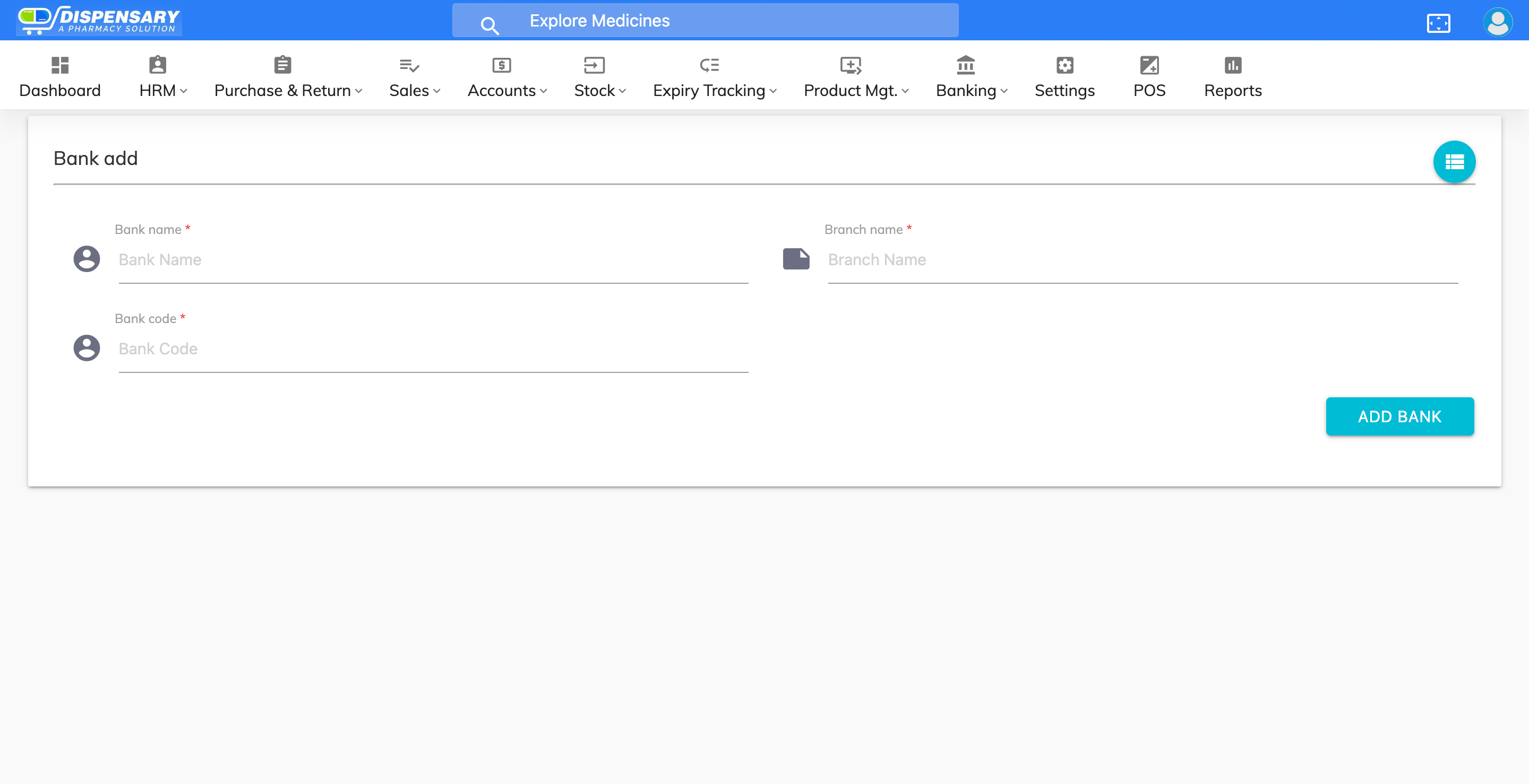 Dispensary banking module allows you to add and manage bank details, including bank name, branch, code, and routing number. It supports creating bank cheques, adding bank deposits, and tracking all bank transactions for efficient financial management.